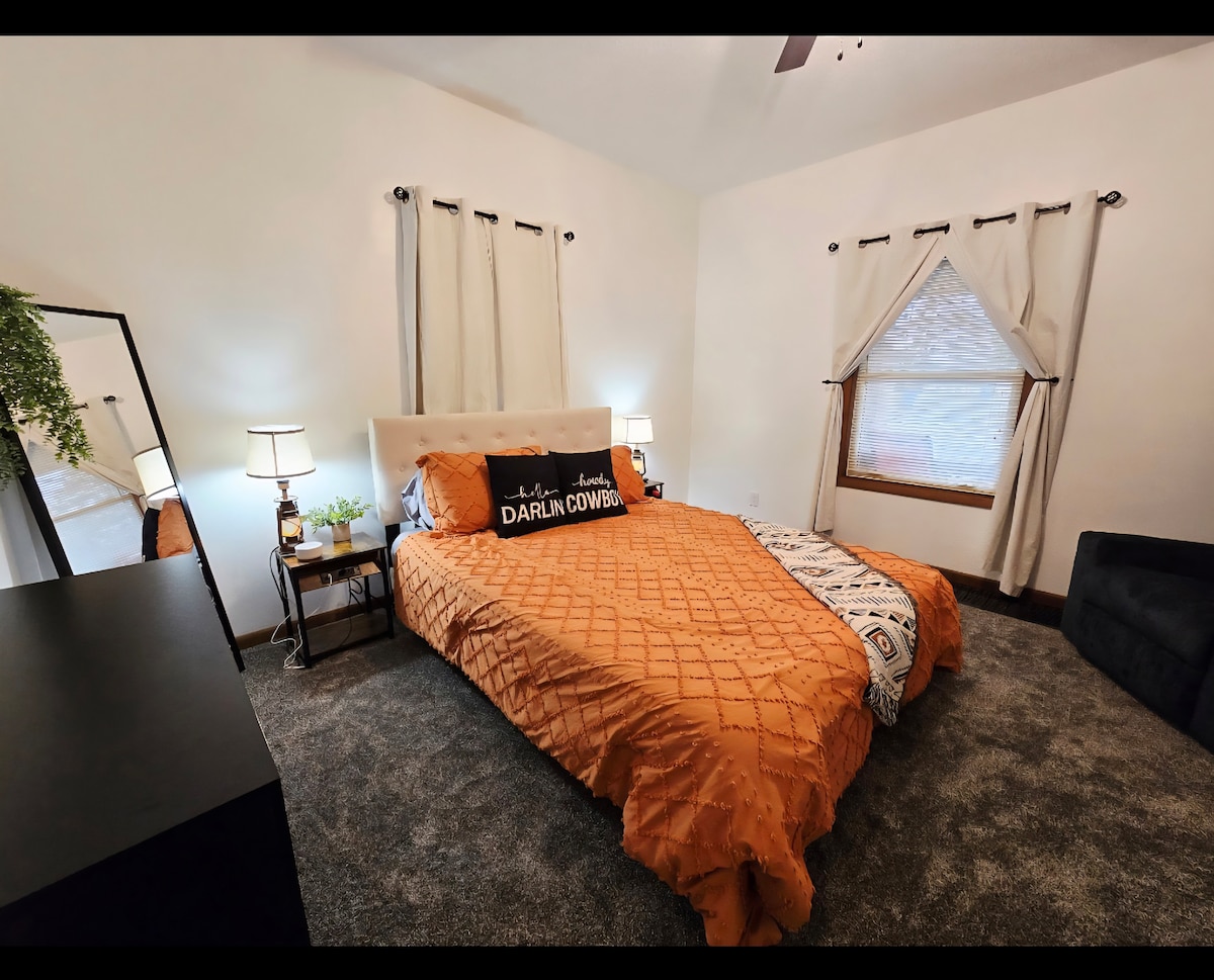 Te encantará nuestro alojamiento. ¡Lee nuestras reseñas y compruébalo por ti mismo! Disfruta de una experiencia de lujo en este céntrico alojamiento. Ofrecemos una casa de un dormitorio y un baño. El dormitorio tiene una cama tamaño queen y el sofá tiene una cama extraíble tamaño queen de espuma viscoelástica. Hemos añadido un escritorio en el comedor y una bonita barra de café en la cocina. Puedes disfrutar del porche delantero cerrado mientras te relajas en las mecedoras. Tenemos una lavadora y secadora de tamaño completo ubicadas fuera de la cocina.