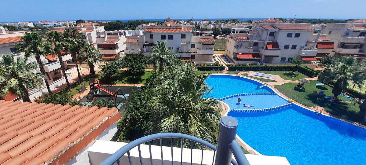 Ático con dos dormitorios, 4 plazas, 1 baño completo, dos terrazas, urbanización con dos piscinas, dos pistas de paddle y dos zonas de juegos para niños. A 600 metros del mar. Vistas al mar y montaña. Muy cuidado. Menaje muy completo.