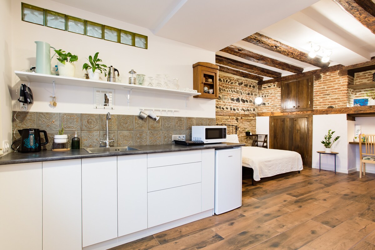 Se trata de un cómodo apartamento renovado con ladrillo visto y auténtico toque tiflisí. Este estudio tiene un baño transparente con bañera moderna, cama tamaño king, sofá Chesterfield, etc. El espacio tiene capacidad para 2 personas y se encuentra en una calle peatonal histórica. Internet wifi de alta velocidad e IPTV (canales internacionales) se proporciona de forma gratuita. El apartamento también está bien situado para el transporte: el metro Marjanishvili y las estaciones de autobús están a poca distancia a pie y te llevan a cualquier lugar de Tiflis en poco tiempo.