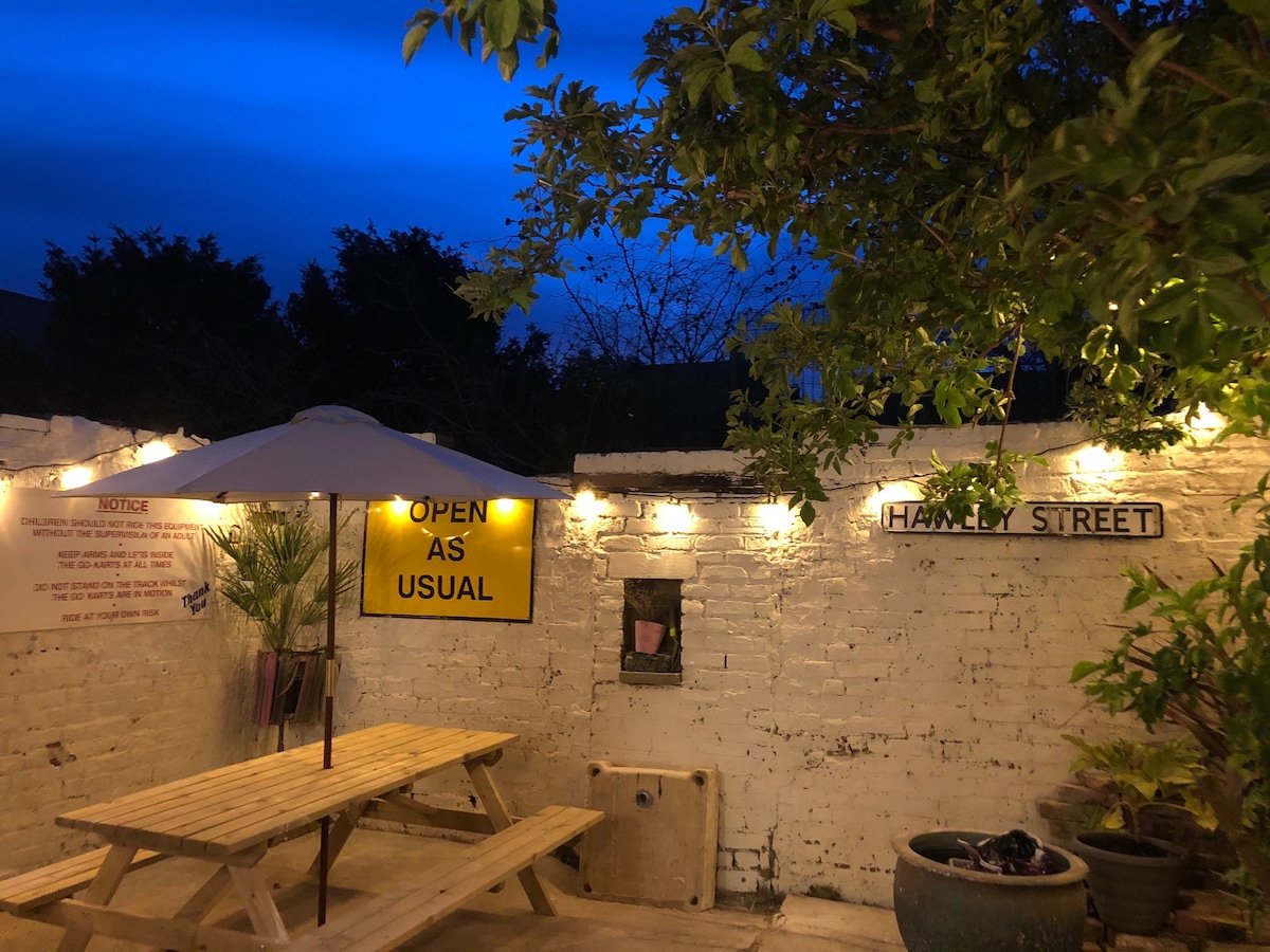 Ubicada en el histórico casco antiguo de Margate, esta propiedad de grado II se encuentra a pocos minutos de la playa, Turner Gallery, Dreamland, tiendas vintage y restaurantes galardonados. La casa cuenta con una cocina bien equipada, una acogedora sala de estar con chimenea y sofá cama, y un rincón acogedor con asientos y servicios de streaming. La planta superior ofrece un dormitorio principal con una cama tamaño queen y TV, una habitación más pequeña con dos camas individuales y un patio privado con una barbacoa para comer al aire libre.