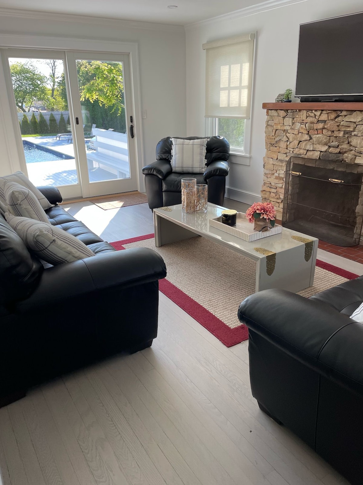 Escape to your chic, serene Hamptons oasis! Enjoy the privacy of your own home just steps to waterfront dining + more Relax poolside, spark up the BBQ + firepit under the starry sky, swim + enjoy the peace + tranquility of this property. Enjoy easy living + convenience; walk 1 block to waterfront dining + cafe. Sip cocktails while you watch the most magnificent sunsets + have morning coffee on the sea. Stream on your 80' TV You'll be 8 minutes to Main St, shopping, beaches, restaurants + more!