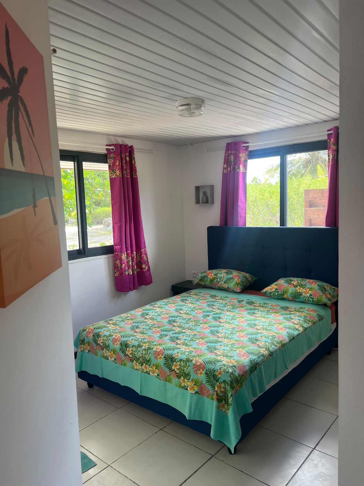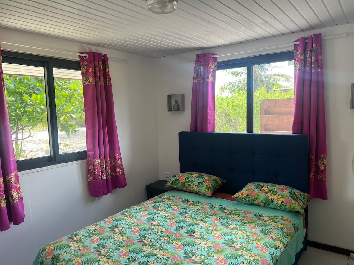 Disfrute en familia de este fabuloso alojamiento que ofrece buenos momentos en perspectiva. A medio camino entre el mar y la laguna y a dos pasos de la única granja perliere de la isla , de un supermercado y pizzería. Nuestro bungalow con aire acondicionado tiene capacidad para 2 adultos y 2 niños. Equipado con una cama grande tamaño king, un sofá cama y una cocina pequeña totalmente equipada. Internet y bicicletas estarán disponibles de forma gratuita. Ofrecemos un servicio de traslado gratuito para sus llegadas y salidas.