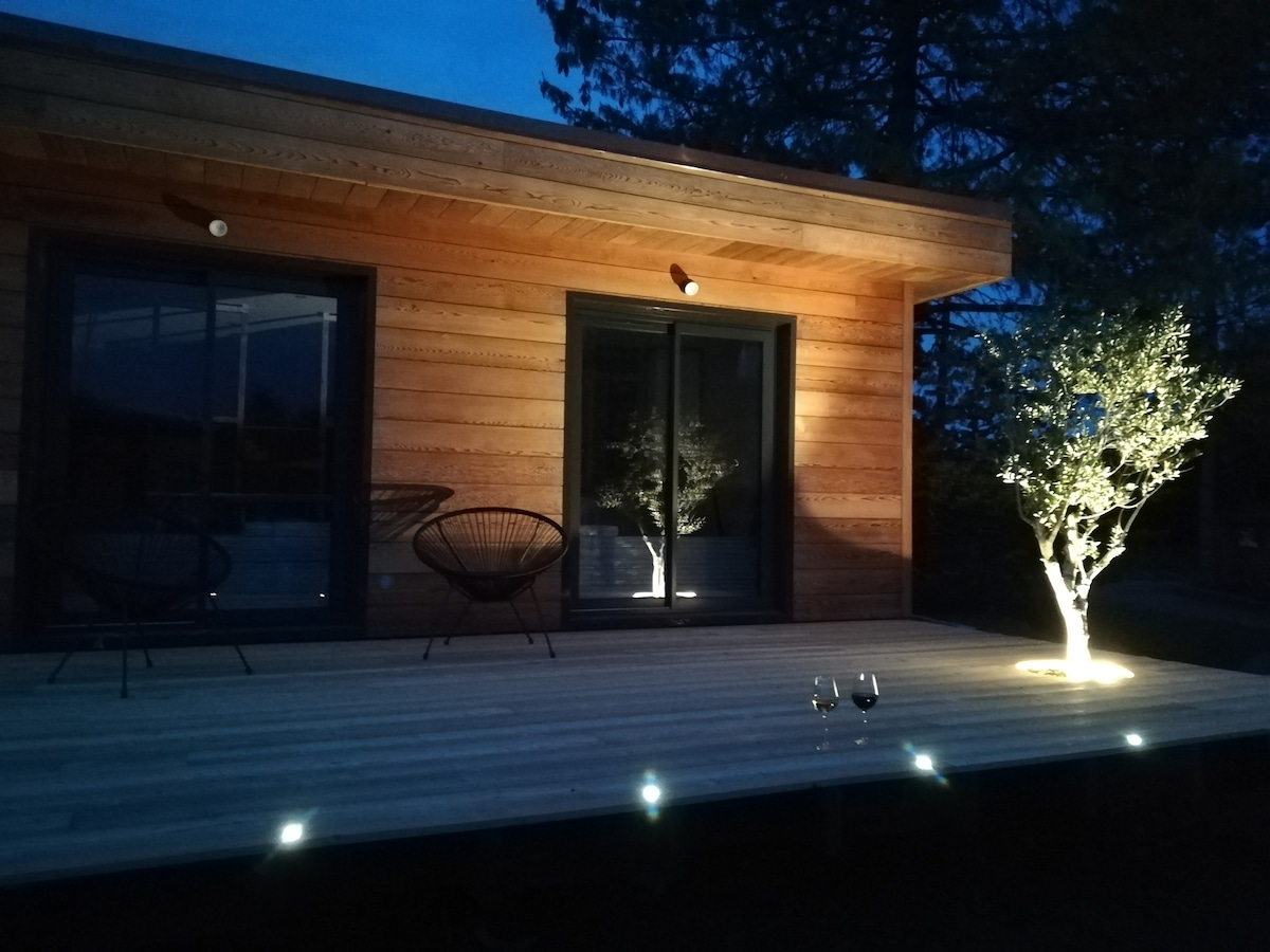 Pequeño chalet «Le Cabouë» tranquilo (18 m² + altillo) Cama de 160 en el altillo Superior < 1,80 Baño con ducha lavabo WC (secador de pelo) Zona de cocina con microondas nevera campana extractora placas de inducción 2 fuegos lavavajillas 6 cubiertos TV: Canal +, Netflix, Apple TV Terraza sur muebles de jardín Spa exterior gratuito durante 1/2 hora de 17:30 a 20:00 Conexión a internet gratuito Aparcamiento privado para un coche Desayunos gratuitos Toallas incluidas Cama hecha a la llegada