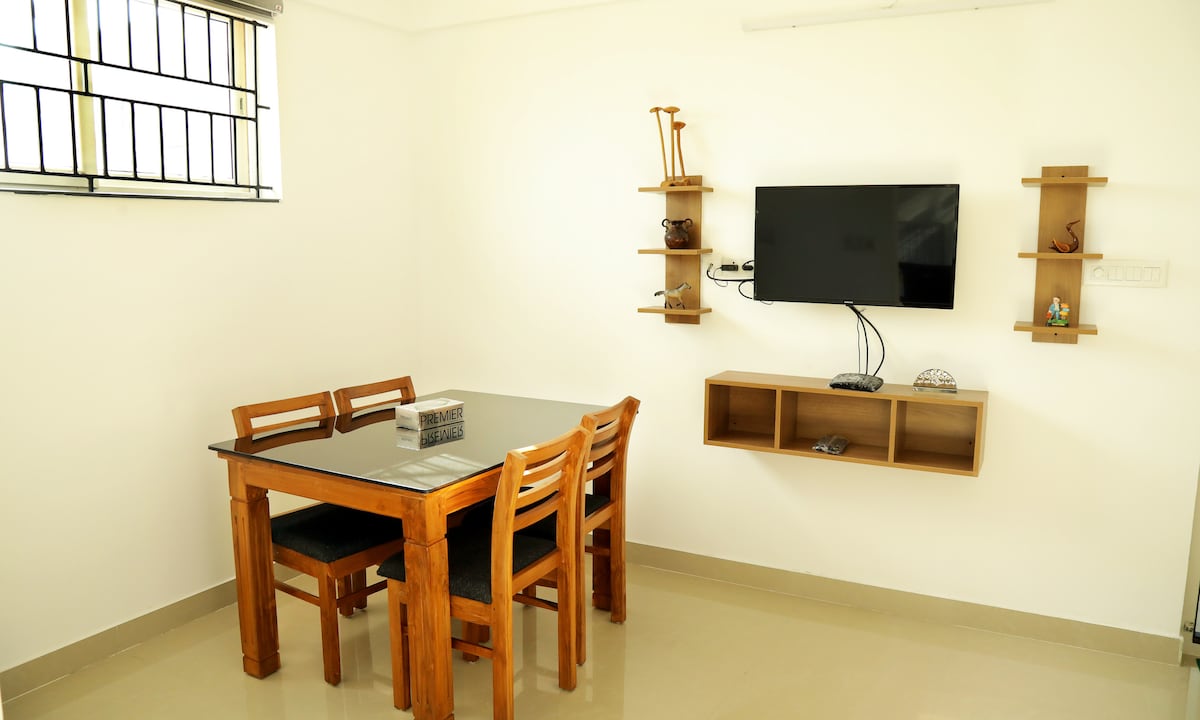 Olvídate de tus preocupaciones en este espacio espacioso y sereno. Ideal para familias . Wi-Fi y TV gratis Aire acondicionado dividido, TV y ventiladores de techo en los dormitorios y enfriador de aire + ventilador de techo en la sala de estar. Cama1 con 2 camas individuales que se pueden unir. Cama 2 con una cama tamaño queen. Sala de estar con un diwan convertible en una cama . Amplia sala de estar donde la zona de estar o el gran comedor se pueden convertir en un espacio de trabajo. A 6 minutos del aeropuerto de Kochi y del centro de convenciones CIAL y a 20 minutos del centro de convenciones de Adlux.