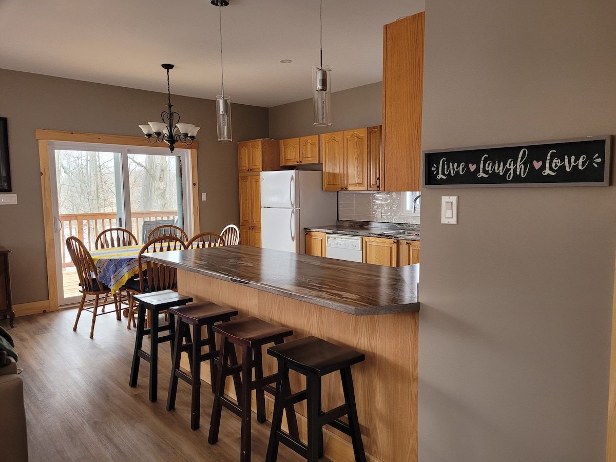 Escápate a esta casa de campo privada de tres dormitorios, estilo chalet, escondida en Buck Bay, en el muy codiciado Bob's Lake. Como no hay vecinos cerca, vas a disfrutar de la paz, el aire fresco y la tranquilidad del bosque y el agua. Pasen sus días explorando, relajándose y disfrutando del tiempo juntos. Hacé una parrillada en la terraza grande, sentate en el muelle a escuchar los sonidos del lago y, para terminar la noche, reunite con tus acompañantes bajo las estrellas alrededor de la gran hoguera al aire libre.