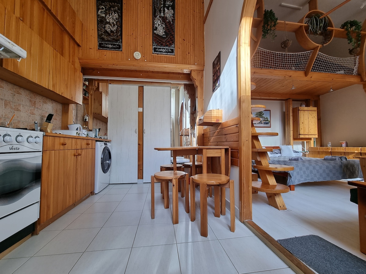 El pequeño y acogedor departamento se ubica en el centro histórico de Miskolc, en uno de los edificios más pintorescos de la calle peatonal. El departamento no es muy grande,pero con su galería de pinos y muebles únicos, es un hogar cálido y agradable para los viajeros que quieren relajarse. Saliendo del edificio bellamente renovado, equipado con un ascensor, nos encontramos inmediatamente en el centro de la ciudad, ofreciendo numerosas tiendas, cafés y pubs. El precio no incluye el impuesto del gobierno local, que es de 450 HUF por persona y noche.