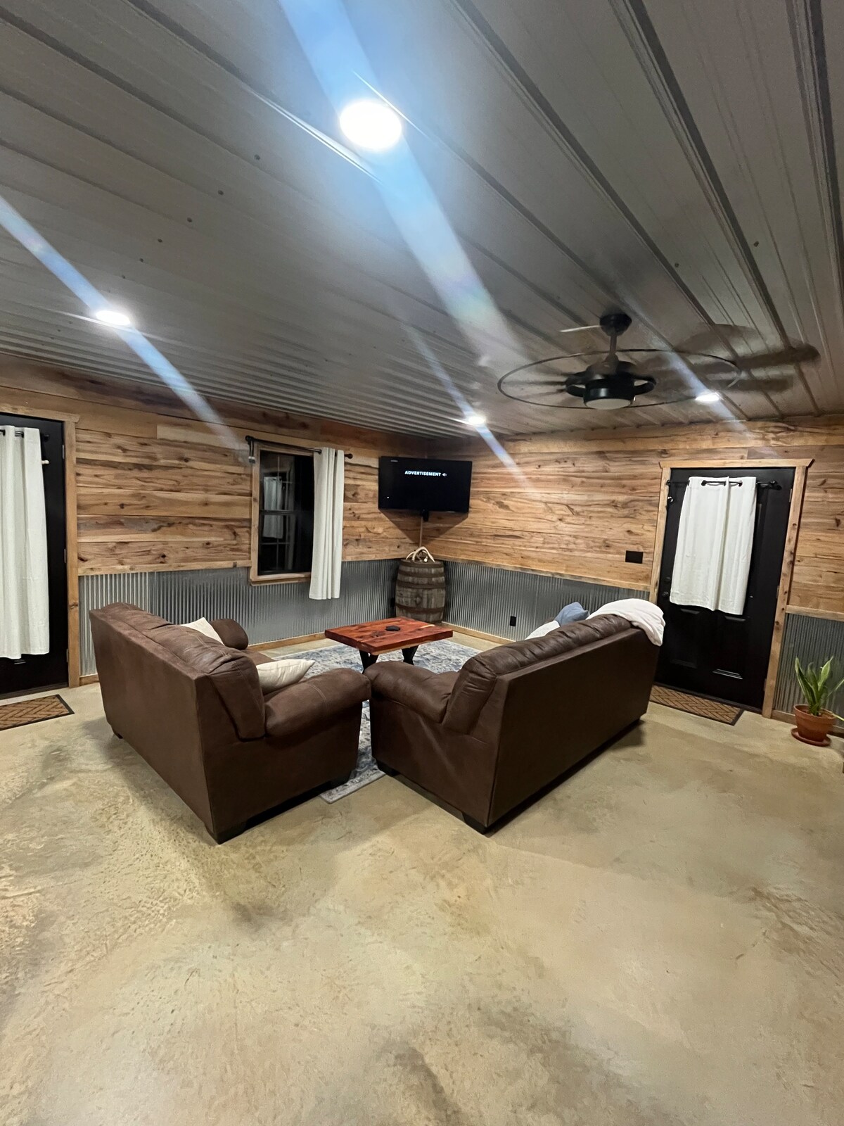 Hotty Toddy! Relax at this unique and private getaway. Located right outside of Oxford with large front porch across the front of the house. Outdoor fire pit area for cool evenings. Very large vaulted living room, small kitchenette, large bathroom with shower and beautiful loft bedroom. Large TV with surround sound and fast Internet services. Only minutes from Ole Miss. Large blowup mattress included.
