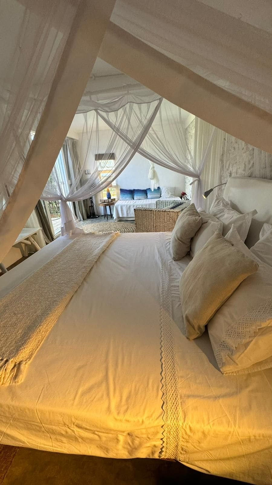 An airy cottage with a rustic charm accessible by 4x4 with a heavenly view. Spacious and well-kitted for a couple on a palm tree-lined dune, with the best view of Barra Beach. Sit in ironwood chairs or sip a cold drink with ice from your ice machine at your breakfast table and gaze on the reef just off Barra Beach, local fishing boats and the north coast of Mozambique stretching into the haze. Marvel at this vista from your comfortable bed. Star gaze on beach sand in front of your stoep.