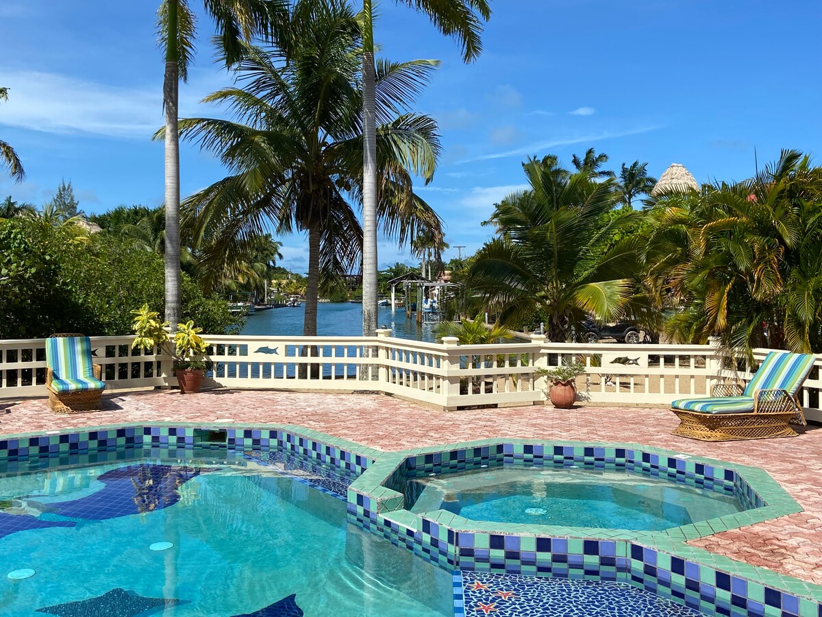 ¡TARIFAS mensuales de temporada BAJA! Totalmente abastecido. ¡Reseñas Rave! ¡Esta casa de playa de estilo encantador está orientada a una pareja romántica y llena de características adicionales! Respaldo solar. Diseñado con techos altos, maderas exóticas, obras de arte, paquete de iluminación de alta gama y muebles artesanales localmente. Una sensación de casa de campo en la playa, frente AL OCÉANO/LAGUNA en su propio canal con magníficas puestas de sol, pájaros y mariposas. Grandes puertas correderas que nunca bloquean 180 vistas al océano caribeño y la laguna, saltos de rayas. DISFRUTA de las brisas frescas