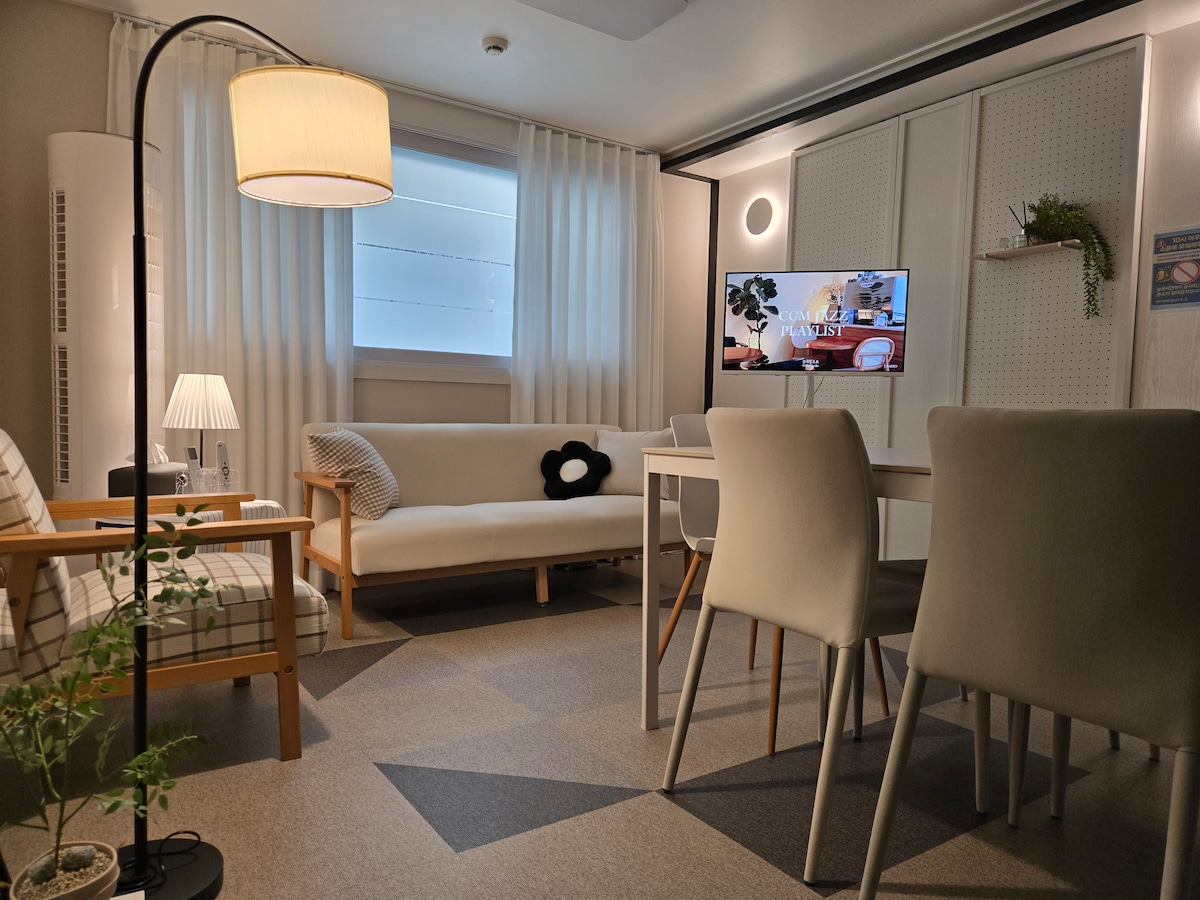 ✅숙소설명을 필독 해주세요✅ ✔️체크인 4pm ✔️체크아웃 11am 호스트가 직접 관리하는 숙소입니다😁 매일 방역 및 청결하게 유지하고 있습니다. 숙소 옵션 -삼성 스마트 TV -삼성 시스템 에어컨 -초고속 wifi 지원 -삼성 스타일러 -드럼 세탁기 -커피 포트기 주방 옵션 -인덕션 2구 -머그잔/와인잔 -s접시/m접시 -냄비1개 -조리도구(집게,국자,가위,칼) -수저셋트 저희 숙소는 간단한 조리(라면)만 가능합니다‼️ 참고해주세요!!😉🙏 ❌삼겹살,스테이크, 국, 찌개류, 파스타❌ 화장실 옵션 -핸드위시 -폼클랜징,클랜징오일 -샴프/컨디셔너/바디워시 -바디로션 -화장솜/면봉 -헤어드라이기 고데기 저희 숙소는 공중 위생관리법(제2조 1항 제2호) 기준을 준수하며 정식"숙박허가"를 받은 숙소입니다.