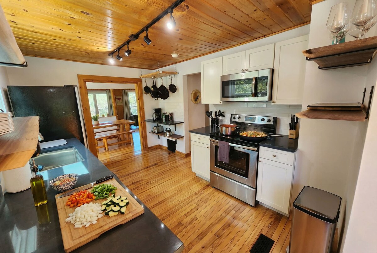 Bienvenido a nuestra casa de campo de los años 40 cuidadosamente diseñada en el bosque a pocos minutos de Good Harbor Beach. Este tranquilo refugio te da acceso al vino, la comida y la naturaleza por los que es conocida la península de Leelanau. Disfruta de la chimenea al aire libre, la parrilla de carbón, el wifi rápido, la televisión inteligente y la cocina bien equipada. El sonido viaja, así que, por favor, respeta a nuestros vecinos. Lo sentimos, no se permiten fiestas ni eventos. Todos son bienvenidos.