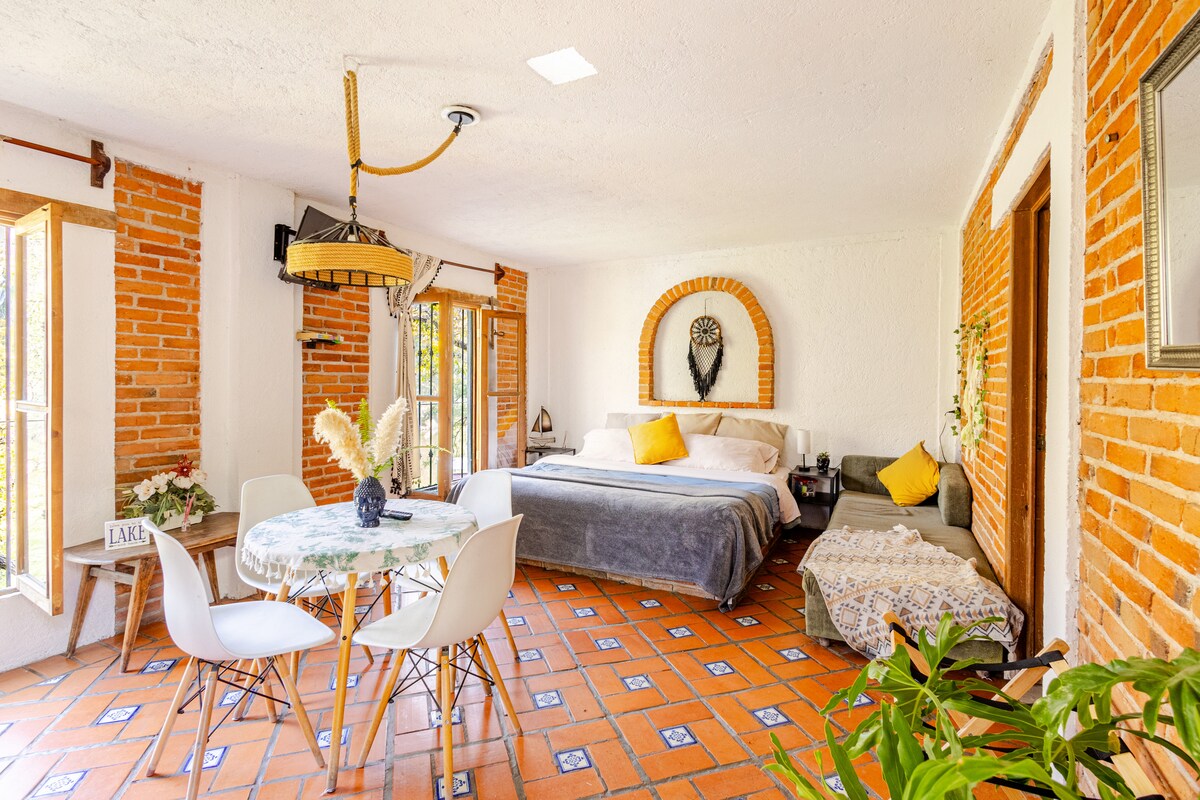 Disfruta de este cálido alojamiento monoambiente de espacios abiertos sin muros increíble para descansar y realizar tus actividades elementales cuenta con un amplio jardín, entrada independiente y cochera para un vehículo, una agradable cocina, pequeña sala de televisión y un espacio con dos camas matrimoniales se encuentra a 5 minutos de plazas comerciales y a 20 minutos del centro histórico