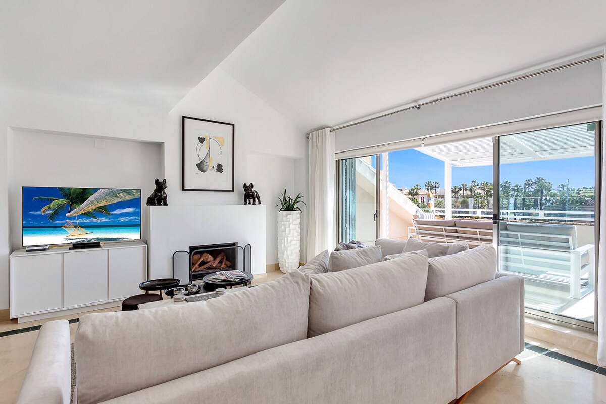 Stunning Beachfront Penthouse with Rooftop Terrace! Enjoy the panoramic sea views, relax and chill to the sound of the waves. A few steps from the beach. Three ensuite bedrooms, two beautiful terraces, a fully equipped kitchen and spacious living area, ideal for relaxation & entertaining. Within walking distance of the marina, shops, local restaurants, beach bars, sailing club, tennis, padel, polo, private beach club with swimming pools. The perfect location to chill & embrace beach life!