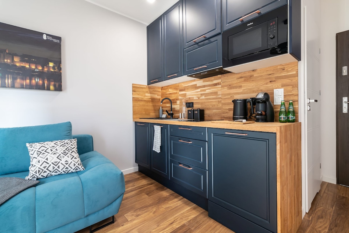 Nowoczesny i funkcjonalny apartament , który został wyposażony w pełnowymiarową kuchnię, w której znajduje się lodówka, zmywarka, płyta indukcyjna, czajnik i toster. Przestronna część dzienna z wygodną rozkładaną sofą oraz wygodna sypialnia z nowoczesną i dużą łazienką sprawiają, że to idealne miejsce na relaksujący pobyt. Centralna lokalizacja umożliwia dostęp do atrakcji turystycznych i mnóstwa klimatycznych restauracji Obiekt zapewnia bezpłatne WiFi i dostęp do kilkuset kanałów telewizyjnych