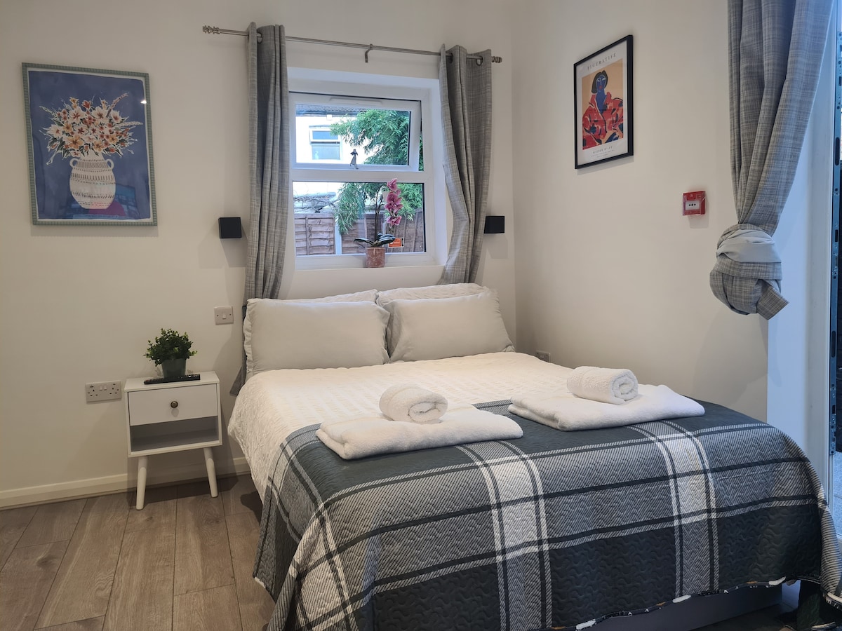Este lujoso espacio en el último piso con vista a los campos te invita a relajarte. Ultralimpio, tranquilo y con un estilo precioso. Equipado con todo lo que necesitás y más. Prepará café fresco con la cafetera Ninja Luxe. Mirá tus programas favoritos en los televisores inteligentes, jugá juegos de mesa en grupo o trabajá donde la vista te inspire. Sea cual sea el propósito de tu estadía, trabajar o relajarte, ¡este es el lugar para estar! Londres está cerca, pero se siente como un mundo aparte. ¡Siempre hay un lugar para estacionar!