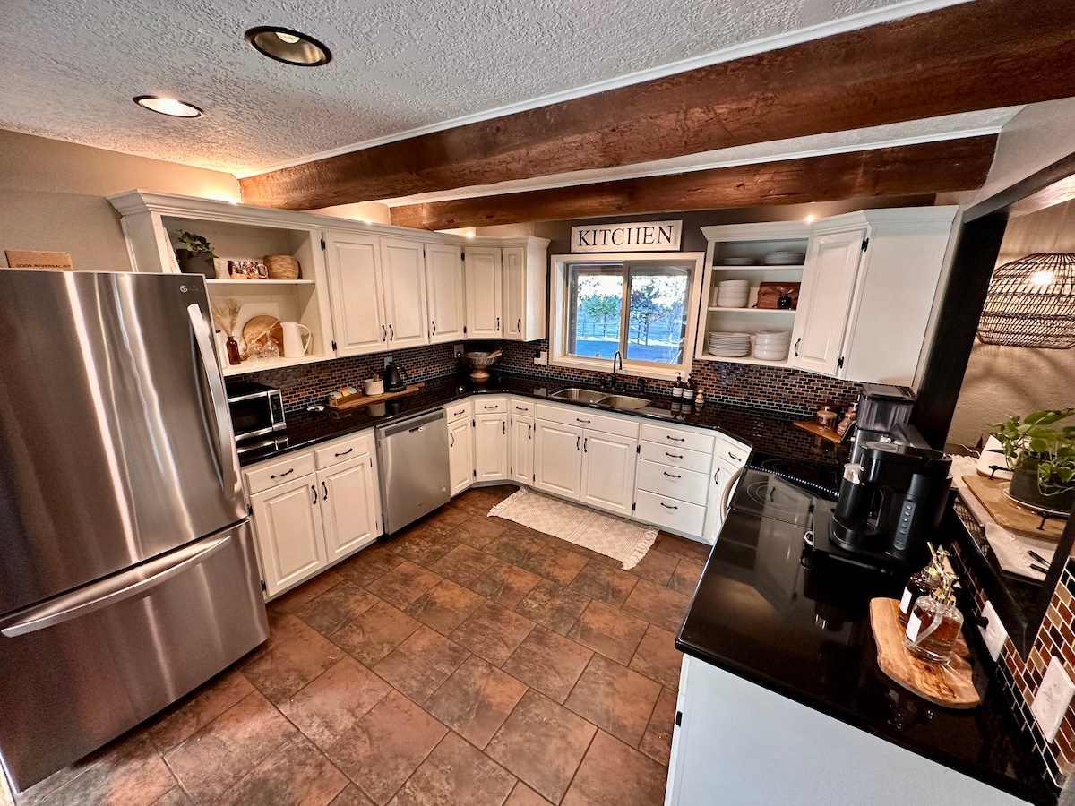 Loft luminoso y espacioso con sala de estar/comedor y cocina abiertos. Sofás grandes y cómodos situados frente a una cálida y acogedora chimenea de gas y TV inteligente. Prepara una comida en la espaciosa cocina con electrodomésticos y armarios nuevos. Todos los platos, utensilios de cocina y cubiertos son nuevos. Disfruta de café en el patio con una cafetera Keurig. Hay 2 dormitorios con camas tamaño queen y una zona de loft abierta en la parte superior de la escalera de caracol con una cama tamaño queen también. Excelente lugar para disfrutar en familia y con amigos.
