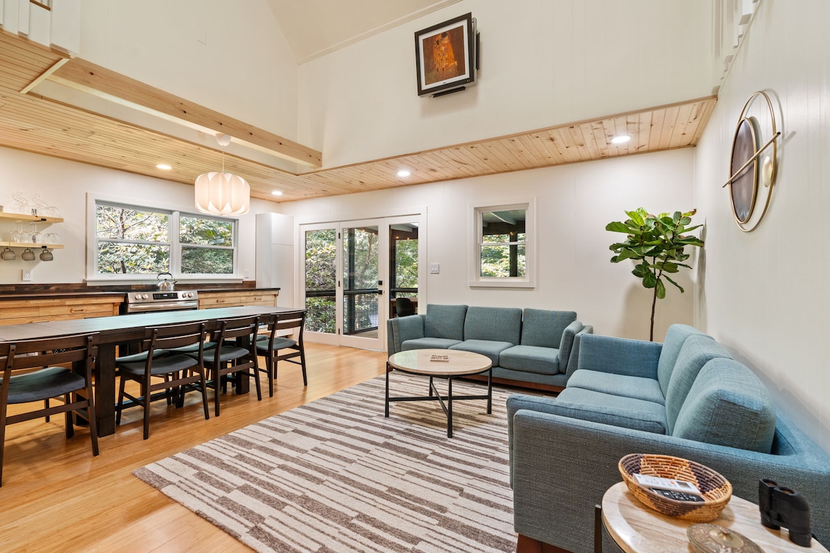 Ubicada en medio de los serenos bosques de Sapphire, esta encantadora casa ofrece un refugio tranquilo. Cuenta con dos amplios dormitorios y dos baños, además de techos de pino, elegantes electrodomésticos de acero inoxidable y una lujosa ducha de azulejos en la suite principal de la planta baja. Relájate junto a la chimenea de leña crepitante o disfruta de una bebida refrescante en la terraza trasera, que cuenta con una mesa con sombrilla. Además, los huéspedes pueden disfrutar de la variedad de servicios disponibles por una tarifa diaria nominal.
