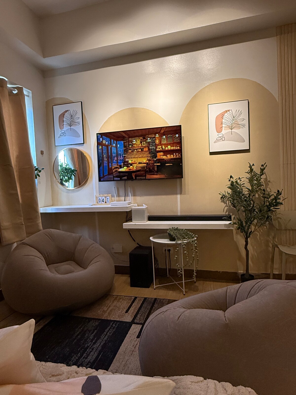 Liam Suite is your dream getaway with an Exclusive Director’s Club Cinema experience. Enjoy cozy comfort and next-level entertainment featuring a 75″ 4K Google TV, PS4 Pro, Samsung surround sound, and cinematic recliners—all in one stylish studio. PLUS a SONY videoke and speaker with a JBL wireless microphone for your sing-along night. Perfect for couples, barkadas, or families! 📍 Located beside SM City Trece, near the Cavite Capitol, Government offices, and public market & transportation.