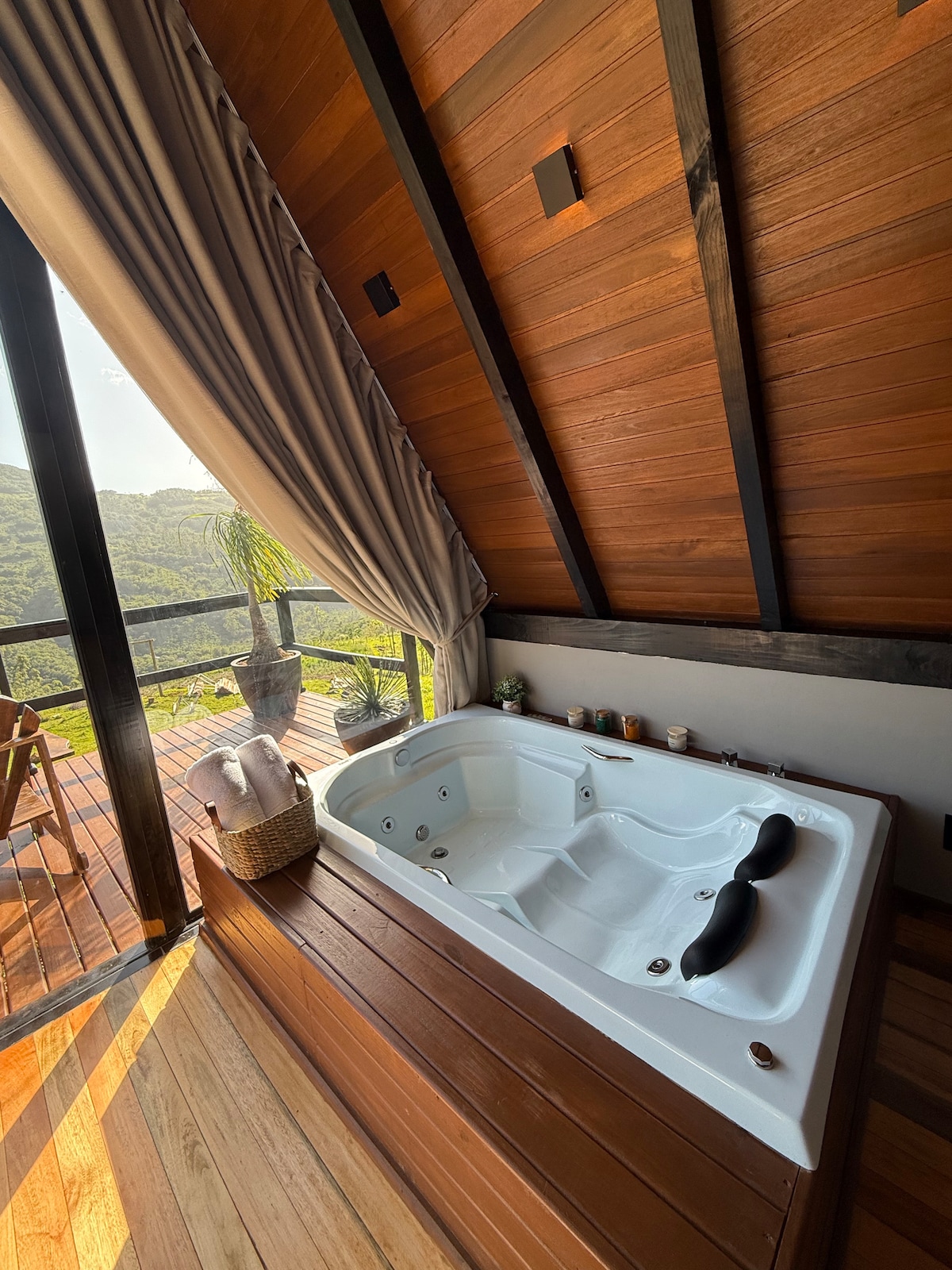 Cabaña Bali: bañera, vista a la laguna y desayuno
