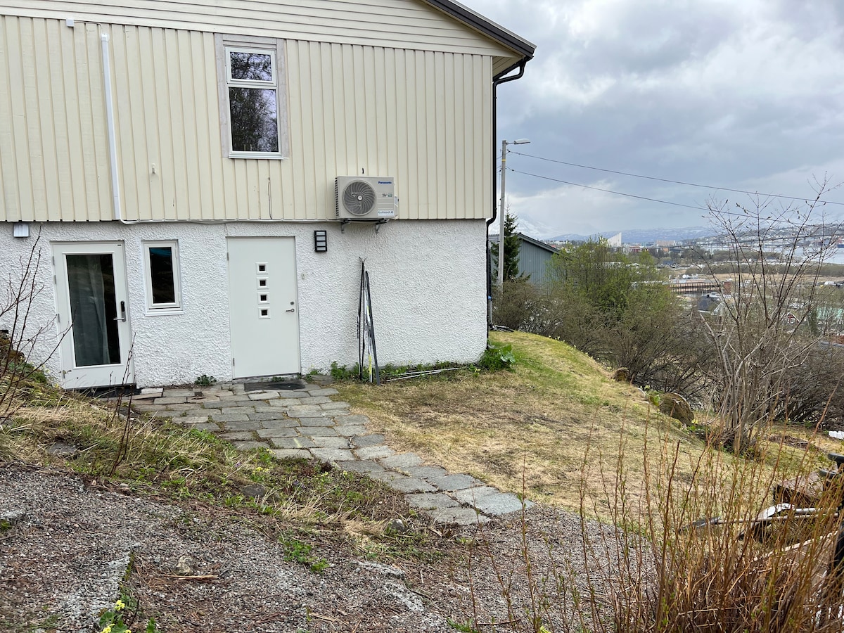 Leilighet i rolig boligområde med direktebusser til sentrum (12min) og flyplass (40min). Morgen og ettermiddag går det direktebuss til sykehuset (UNN) (16min). Perfekt plassering for å se nordlys, med kort vei til områder med lite lysforurensning. Alpinanlegget like i nærheten. Bad, soverom, stue med sovesofa, kjøkken med alt man trenger: mikrobølgeovn, vannkoker, brødrister, oppvaskmaskin, kjøleskap med frys. Sengetøy og håndklær. I perioden 15.06 - 1.07 går solen aldri ned over leiligheten.