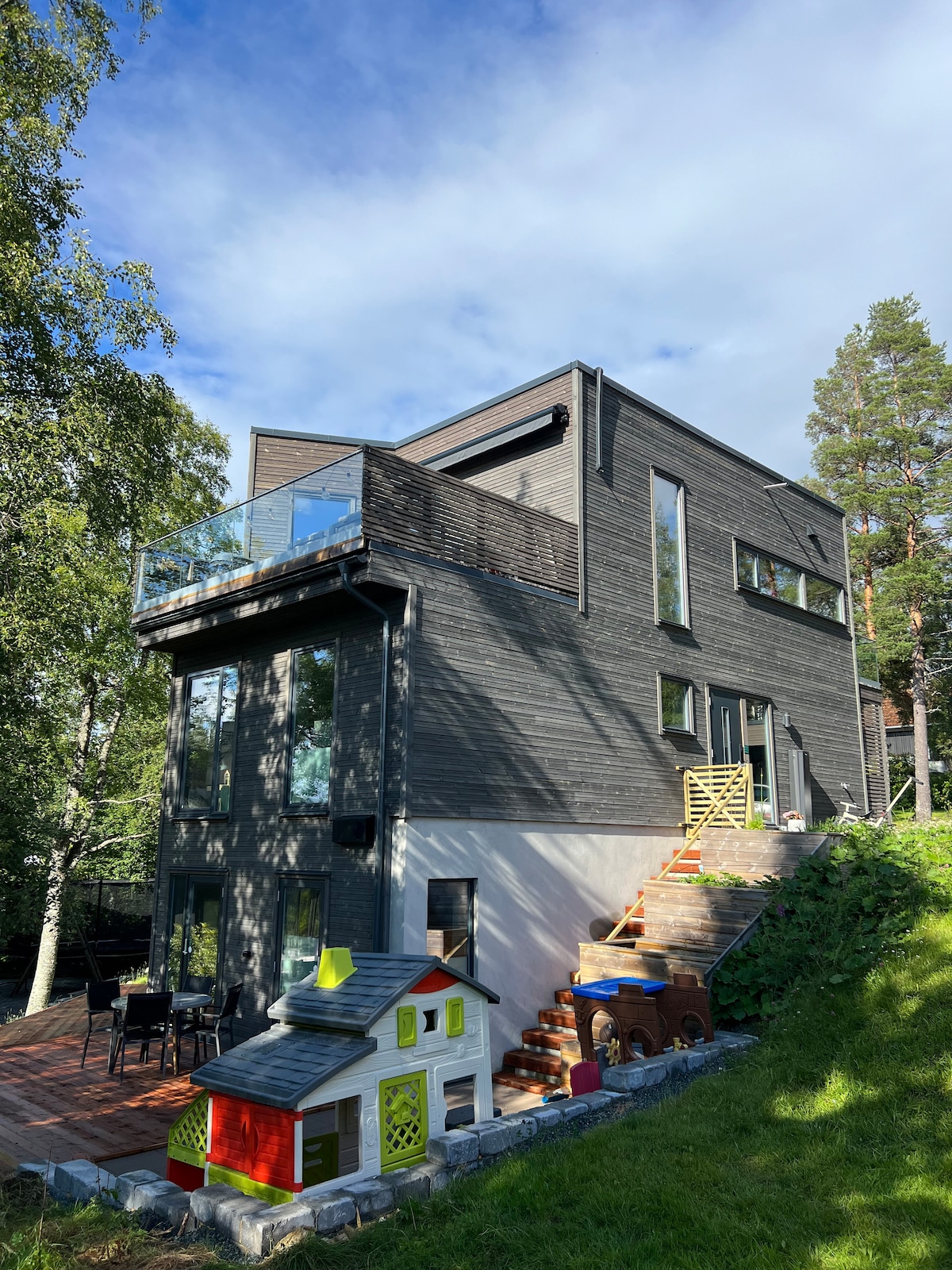 Casa grande y espaciosa con 3 salas de estar, 2 baños y 5 dormitorios. Gran espacio de estacionamiento fuera de la casa. Gran jardín con sala de juegos, cama elástica, piscina, ducha al aire libre, cocina al aire libre y gran sala de jardín con TV y lámparas de calor. La casa está en una zona tranquila, y a solo unos minutos a pie del autobús,tren, taxi. Aquí encontrarás tiendas locales, tiendas de comestibles, restaurantes, monopolio del vino, etc. A 15 minutos en coche/autobús del centro de la ciudad de Trondheim. En invierno, hay pistas de esquí preparadas a 300 metros de la casa que te llevarán directamente a los senderos de la Copa del Mundo.