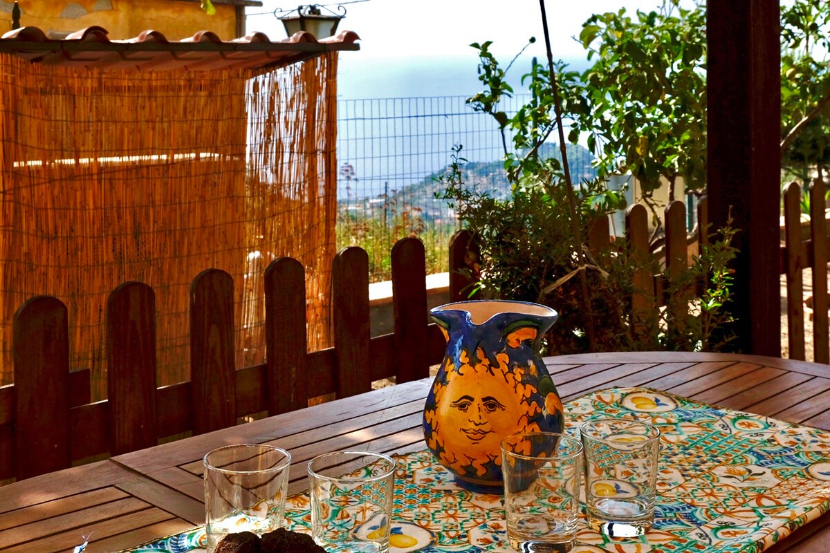 A small house but at the same time "immense" thanks to the large windows from which you can enjoy the view of the sea and Etna. The antique-style furniture and some furnishing objects such as lamps and paintings give the house an authentic, even slightly bohemian flavour. The space is divided into two areas, living area and sleeping area. The patio at the entrance, covered by the ancient carob tree, always offers fresh, regenerating air. And some plants for a super natural cuisine!