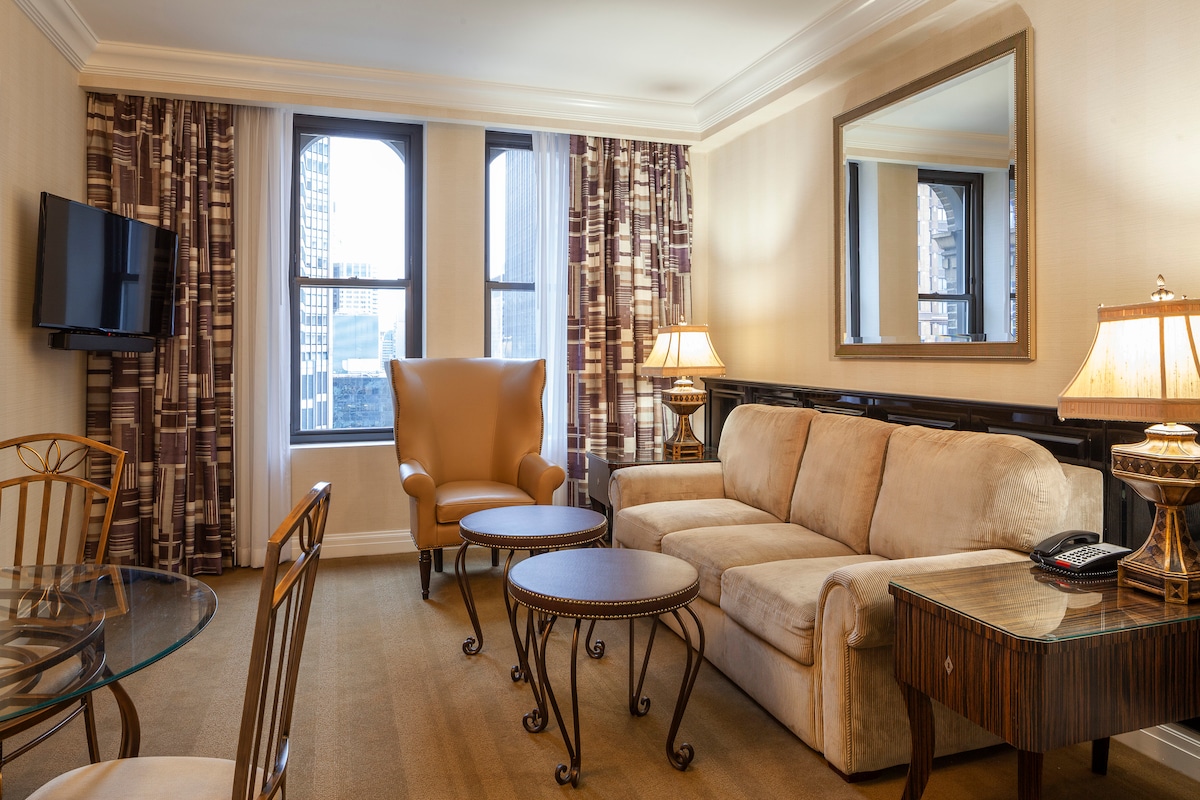 Una versátil suite king perfecta para parejas y viajeros de negocios. La luz del sol llena la sala de estar, creando un espacio inspirador para el trabajo y el ocio. Patrones lúdicos como el papel tapiz impreso en dominó y las obras de arte seleccionadas de artistas locales transforman esta habitación en un destino dinámico de vacaciones. Diseñado para la productividad, el romance y todo lo demás, tu hogar lejos del hogar te espera.