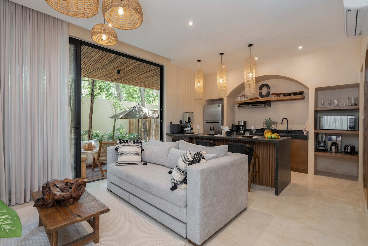3 Min Walk to Centro Tulum 5 Min Drive to Tulum Beach 5 Min Drive to Tulum Ruins When you stay in this beautifully designed, modern studio located right near Centro Tulum, indoor and outdoor living blend together seamlessly. Modern with fiber WiFi, and open bedroom, a sleek modern kitchen, spacious living areas, and luxurious pools, this quiet retreat is also minutes from the best restaurants and bars. Balcony is next to a serene waterfall. Experience Tulum With Us & Learn More Below!
