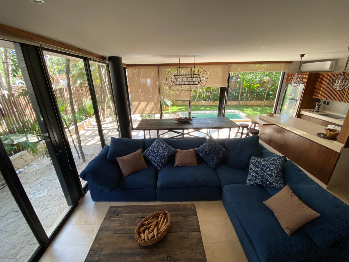 Hermosa casa adosada con un toque de estilos modernos y boho chic con comodidades privadas ubicada en el centro - A poca distancia a pie de restaurantes. -3 cuadras de la carretera principal al centro de la ciudad - A 15 minutos en coche de la franja de Tulum. -Internet de alta velocidad 500 Mbps - Área cerrada - Estacionamiento privado - 3 dormitorios con baño privado - Juego de barbacoa y comedor para 6 - Jacuzzi relajante. - Cocina totalmente equipada y lavandería en la unidad. - Se ofrece el servicio de conserjería.
