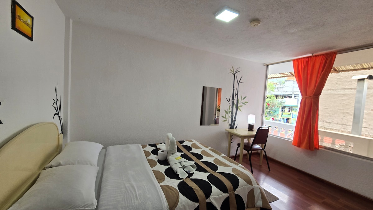 Inviting double room ideal for travelers who want comfort without overspending. Bathroom is shared and kept exceptionally clean. Guests enjoy access to wide-open grounds, rustic design, relaxing common spaces, and convenient parking. Close to Baños’ most popular destinations while offering a peaceful retreat surrounded by nature.
