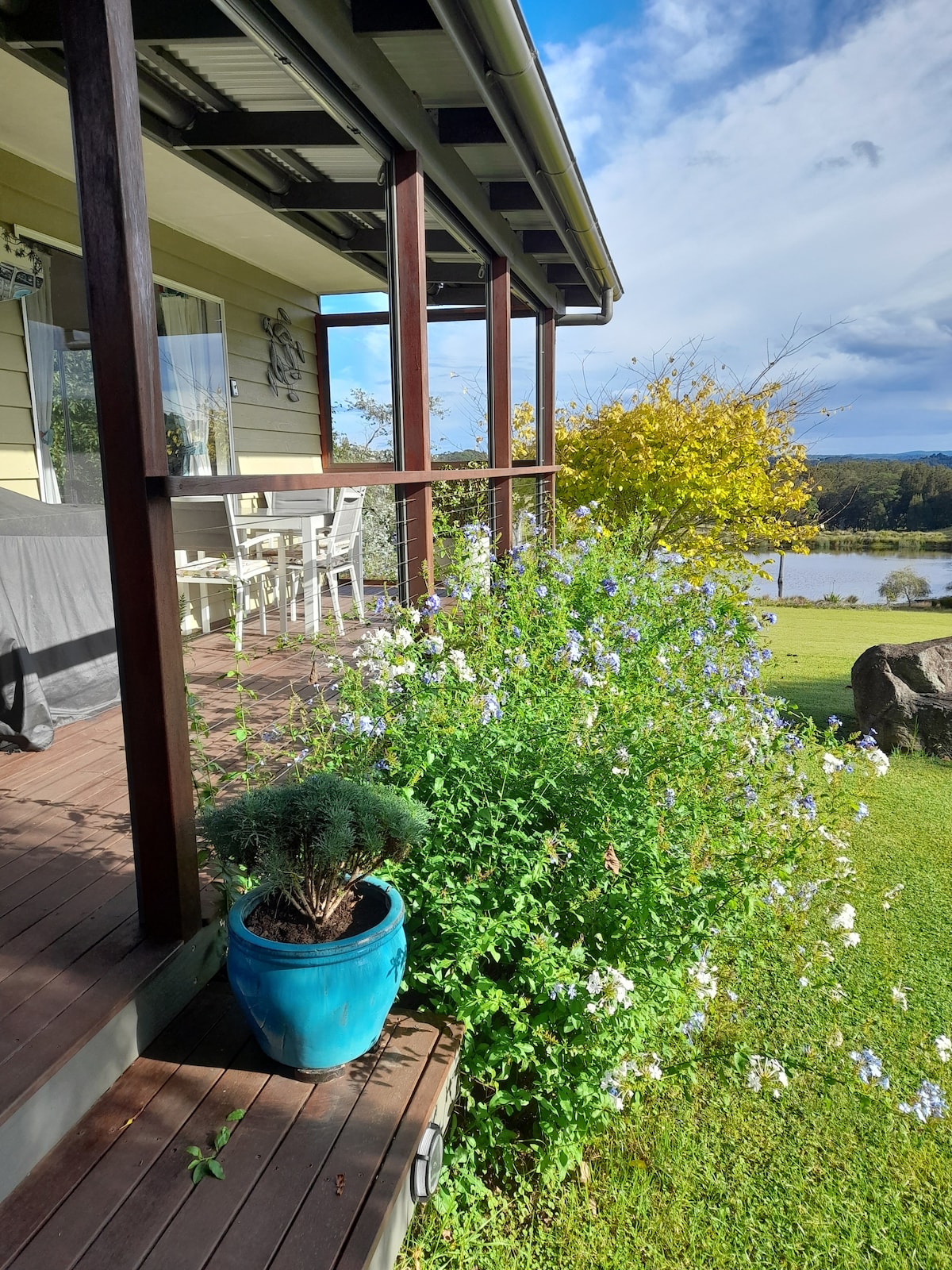 Nuestro alojamiento independiente, cómodo y bien equipado, está situado debajo de nuestra casa familiar. Está a 1 km de la playa y el río, y a 6 km de la ciudad rural de Moruya en la costa sur de Nueva Gales del Sur. Natación, pesca, kayak, mercados, paseos por la selva, senderos para bicicletas o relajarse. Todo está aquí para ti y tu familia. A tu mascota también le damos la bienvenida. Tenemos una gran zona de césped vallada con un cable de 1,6 m de altura donde tu perro puede correr, y nuestra playa local es un parque infantil para perros sin correa las 24 horas.