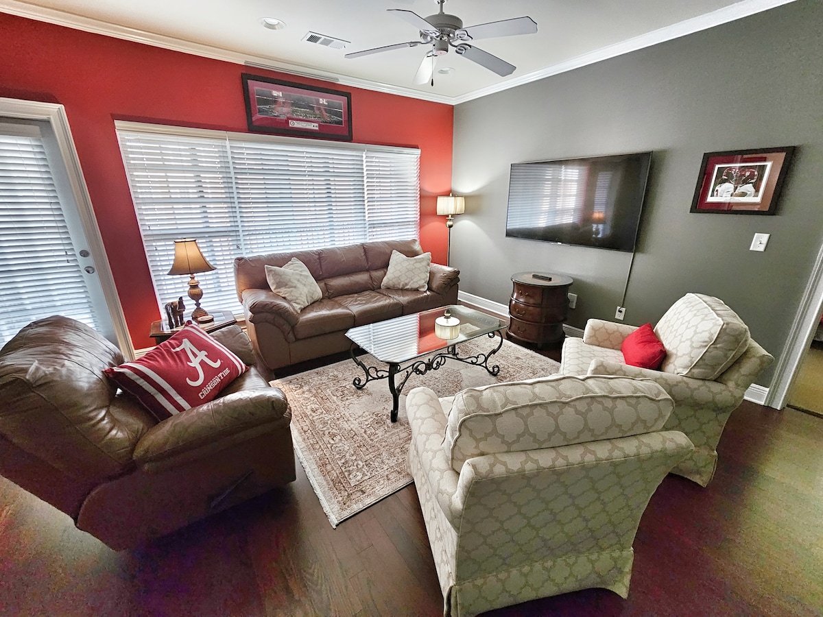 - Casa adosada grande a 2 manzanas de University Blvd y a 3 manzanas del estadio Bryant Denny. - Cocina totalmente equipada y baños con todos los elementos básicos. - Wifi extremadamente rápido. - Amplia casa adosada con mucho espacio para toda la familia. - A poca distancia a pie de muchos restaurantes y atracciones locales. - Sala de estar, cocina y medio baño en la planta baja; dormitorios y 3 baños completos en el segundo piso. - Televisores inteligentes con YoutubeTV, Disney+ y Netflix incluidos. - Zona de patio trasero fuera de la sala de estar.