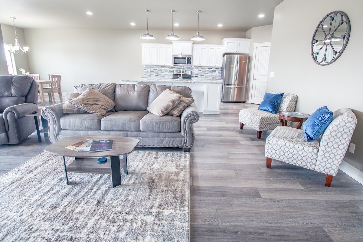 * Nueva construcción de 2019, totalmente amueblada. * Aproximadamente 1800 pies cuadrados de espacio habitable. * A poca distancia a pie del Hospital y de Grace Assisted Living * El garaje para 2 coches permite la entrada directa/privada a alojamiento * Televisores de alta definición montados en la pared en el dormitorio principal y en la sala de estar. * Gran vestidor en el dormitorio principal. * Doble tocador en el baño principal. * Patio cubierto. * Patio cerrado. * Lavadora y secadora * Explora las cercanas y pintorescas cataratas Shoshone. el parque Centennial Waterfront o camina por el sendero Rim Path