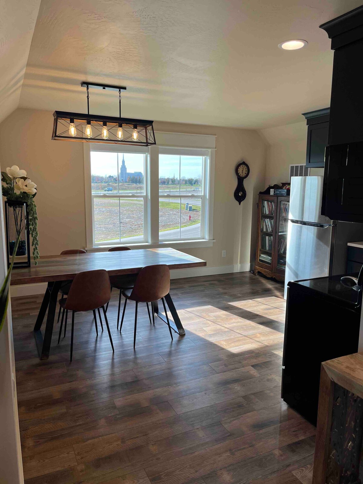 Departamento nuevo, artístico, espacioso, lujoso y privado. Siéntete como en casa con una cama tamaño king, un nuevo sofá tamaño queen de espuma viscoelástica y una otomana extraíble de tamaño completo. Cuenta con una cocina completa y comedor con platos, pequeños electrodomésticos, utensilios básicos de cocina, café, condimentos y barra de aperitivos. La vista es increíble. Verás los mejores campos de Idaho, el lago Mary Alice, el ganado, los amaneceres y los juegos, e incluso unas vistas espectaculares del templo. Ducha en el baño majestuoso para incluir lavadora y secadora.