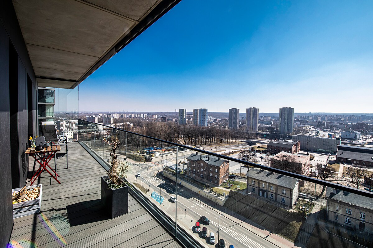 Sunny, comfortable apartment in the First District. Breathtaking 10th-floor view! Over 100m2 space (including 20m of terraces) - 2 private lockable bedrooms for sleeping and work, plus 2 more sleeping spots in the living room. Perfect for singles, couples, and business travelers with or without family. Excellent location near Spodek, NOSPR, and the Congress Center. Building features a convenience store, barber, Thai massage salon, Wine Taste by Kamecki.