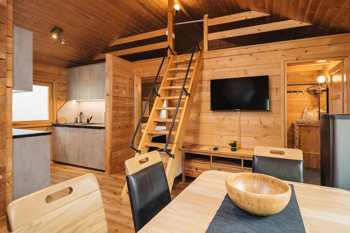 Nuestro acogedor chalet de madera tirolesa ofrece un encanto único y espacio para 6 personas: un dormitorio con cómoda cama doble con somier y TV adicional, otro dormitorio con 2 literas y en el altillo hay dos camas individuales más. La cocina está totalmente equipada con todo lo necesario. La gran terraza con magníficas vistas a la montaña ofrece muebles de jardín para comer y relajarse. Para los niños, hay un tobogán, una valla mantiene a los niños pequeños en la casa.
