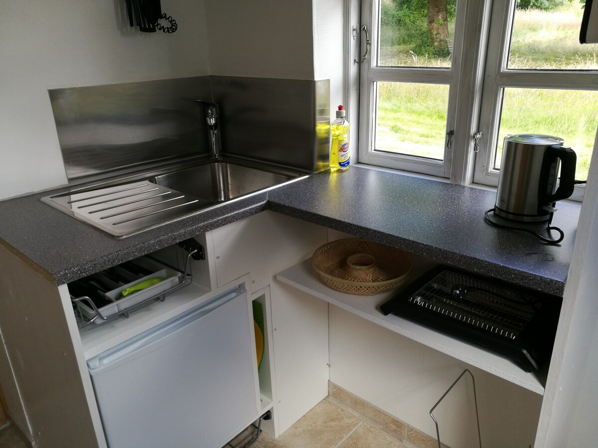 Habitación grande recién construida en un edificio separado en una propiedad agrícola. Entrada privada. La vivienda consta de salón/cocina, dormitorio y baño. Un total de 30 m2. Todo en materiales luminosos y agradables. Hay nevera, horno/microondas y placa de inducción. La vivienda está equipada con todos los servicios de cocina necesarios, vasos y cubiertos. Es posible pedir prestado Chromecast.