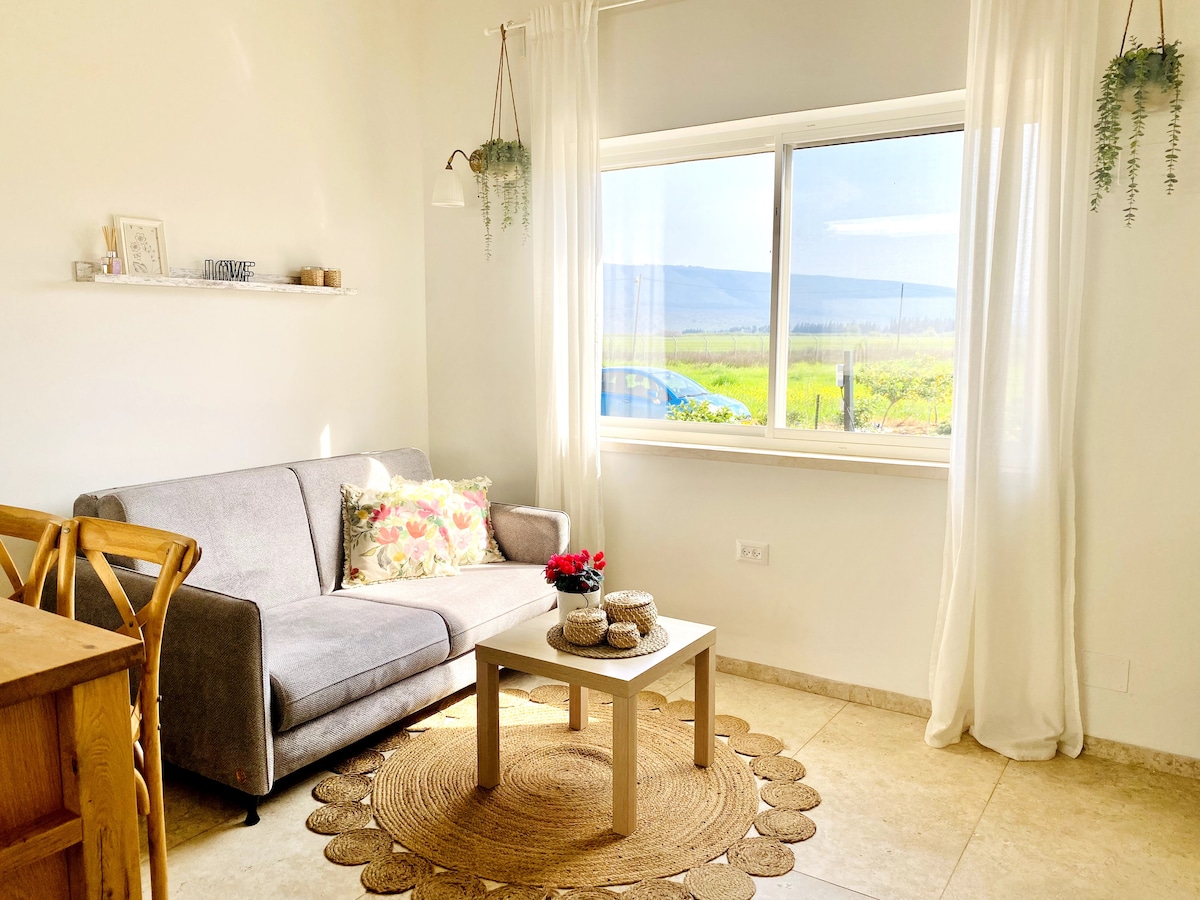 A quiet and stylish guest unit in Kibbutz Dafna with open views of Mount Hermon. Includes a large bedroom with a double bed, a living area with a double sofa bed (190×160) and a single sofa bed. Baby cot and high chair available. Equipped kitchenette, bathroom with walk-in shower, and a covered balcony with seating. Walking distance to cafés, restaurants, the Dafnela complex, Teva Naot factory store, the kibbutz stream, and walking paths.