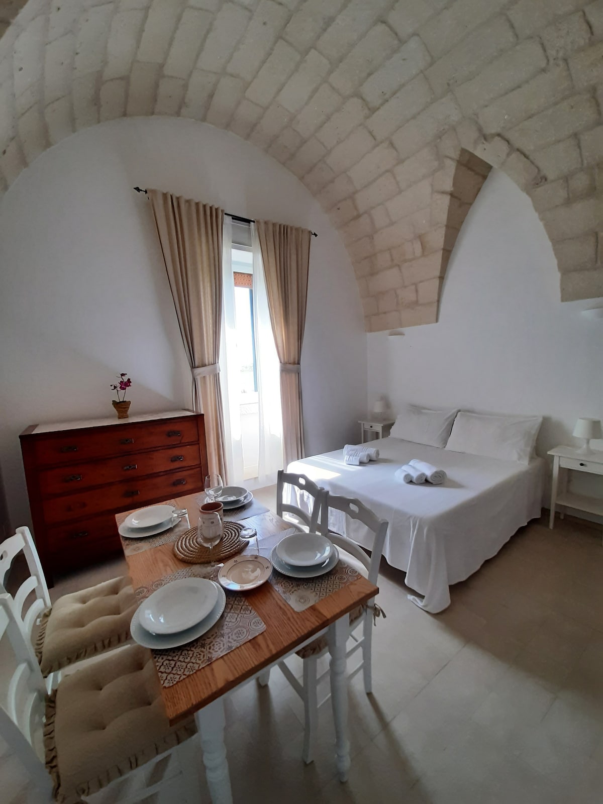 Cosy cottage in quiet, leafy cul-de-sac in the heart of Otranto. Bedroom, bathroom (with shower), living room/kitchenette, tiny private terrace. Air conditioned. Very close to the Cathedral, the Castle, the sea and the beaches. At the beginning of 2024 the walls were repainted with natural lime, USB sockets and a new refrigerator were installed.