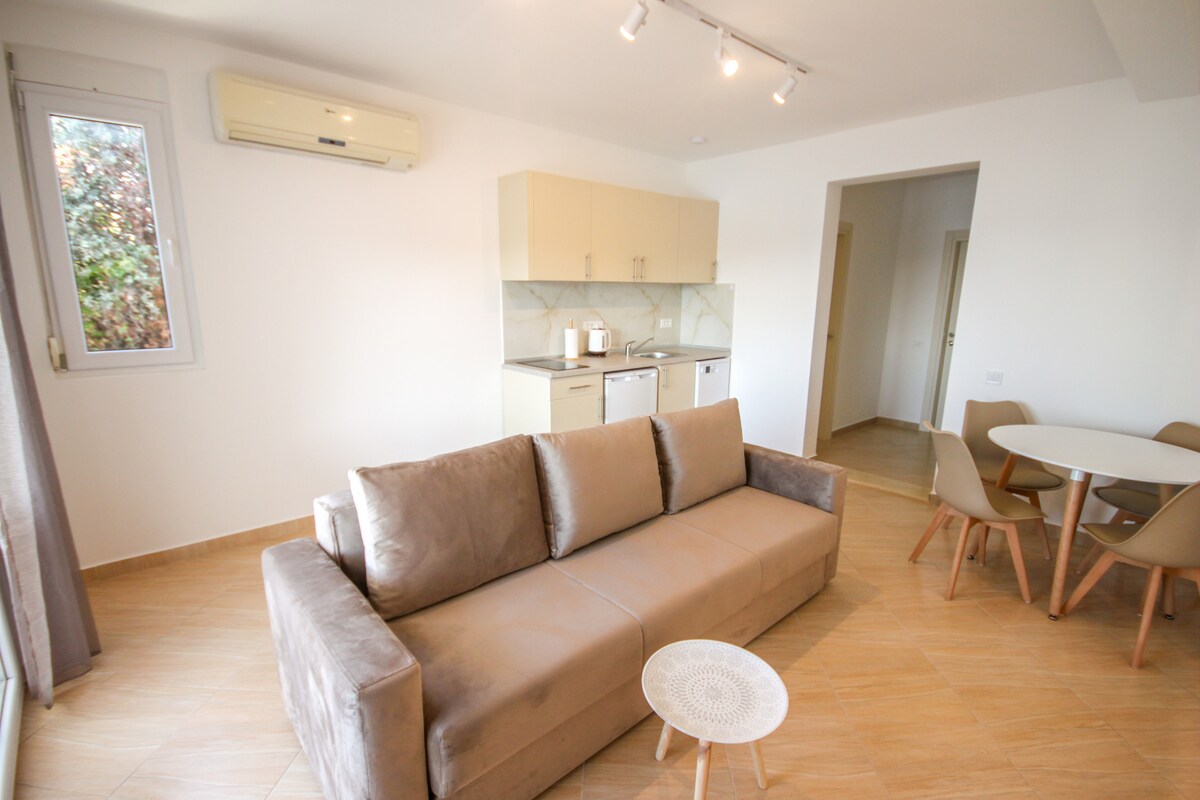 Mediterranean Seaside Private Beach House Escape the crowds and discover a brand NEW, fully private apartment paradise! Enjoy direct, exclusive access to your own secluded beach area, reserved only for you. This spacious apartment (capacity up to 5 guests) is perfect for families or young couples seeking peace, intimacy, and a genuine connection with nature in Kruče, Ulcinj. Private Beach Access: Just 30 steps lead you directly from the apartment to your exclusive beach spot