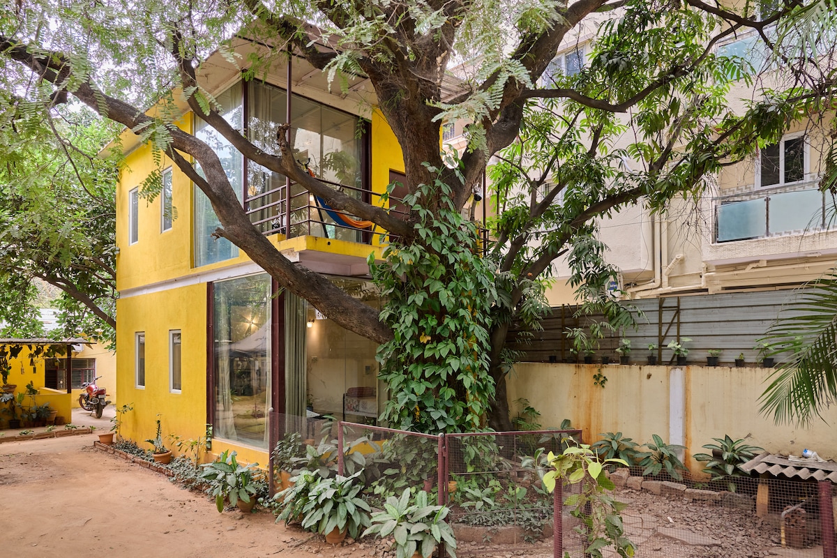 A spacious 1-bedroom studio in the heart of Indiranagar with a private balcony, potted plants, a mango tree, and a kitchen. Thoughtfully designed - minimal, homely style - filled with natural light and quiet charm. A 1 min walk from the metro and some of Bangalore’s best cafés. An extension of our calm way of life — ideal for solo travellers, couples, and work trips. Birds and butterflies often drop by to say hello. Includes King bed Wi-Fi+workspace Modern bath Kitchenette with essentials only
