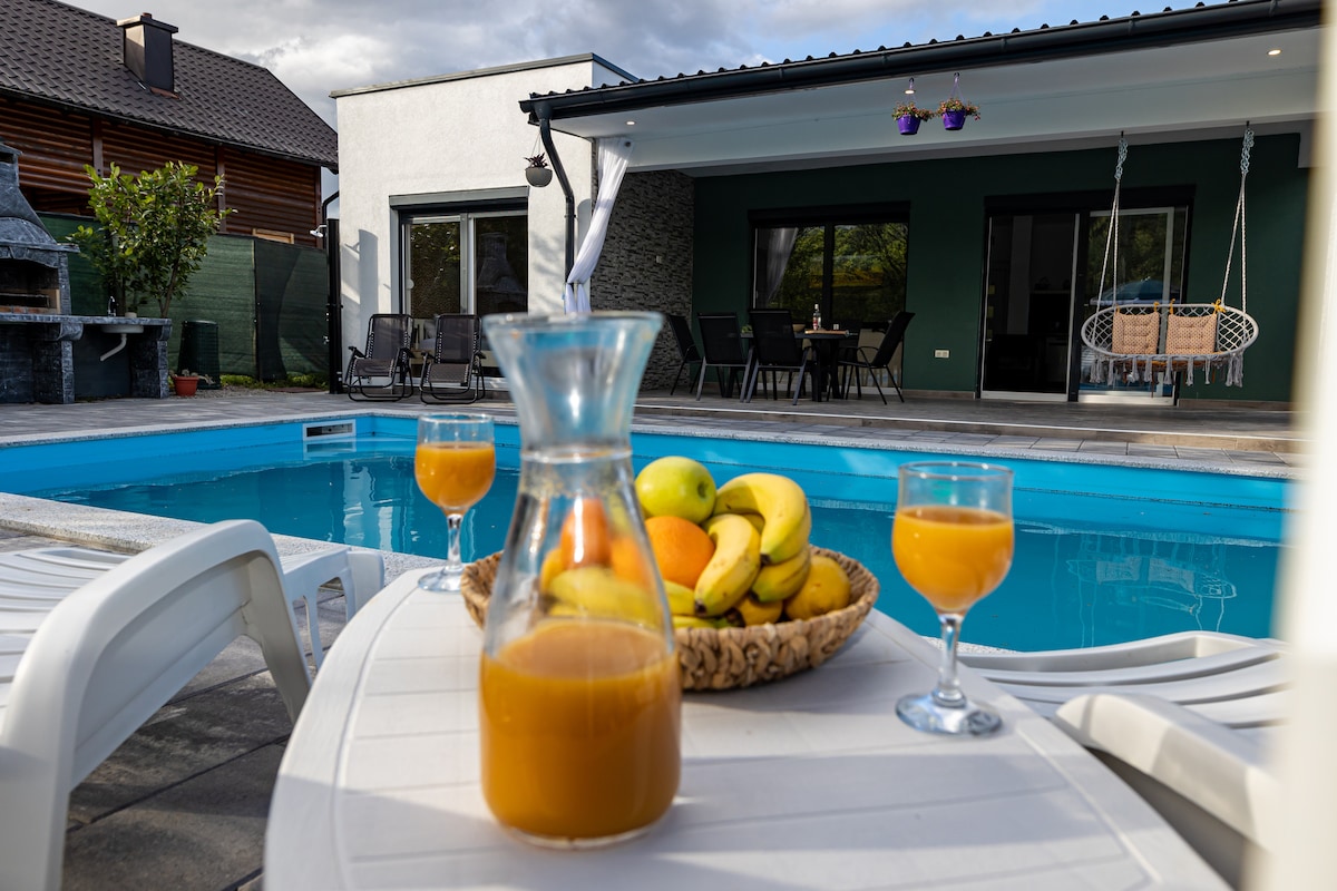 Raskomotite se i opustite u ovom mirnom, elegantnom smještaju i potpunog privatnog opuštanja u našoj vili s bazenom! Naša ponuda obuhvaća prostrane unutarnje prostore opremljene lijepim namještajem, smještaj za do 8 osoba, s prostornim dnevnim boravkom, potpuno opremljenom kuhinjom i udobnim spavaćim sobama, dok vanjski prostor pruža intimnost i mir s prekrasnim bazenom okruženim bujnim zelenilom. Ova kuća je idealna za sve koji traže izvanredno iskustvo udobnosti uz potpunu privatnost.