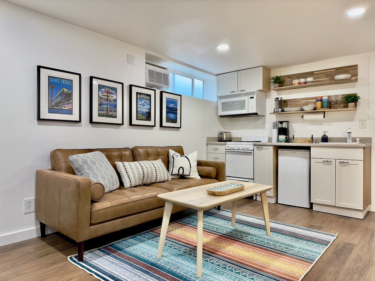 Perfect airbnb to explore Seattle and see Cherry blossom this Spring 🌸🌸🌸. Welcome to our NEW and spacious (~500 sq ft) airbnb. This space features 2 comfortable King beds, a well-stocked kitchenette, and AC. It is in a beautiful, safe, and quiet neighborhood by I-5, saving you time 🚙. 🏆 What makes us a top 1% Airbnb: 1. Cozy: Cute and smart layout. 2. Clean: We spend 3 hours cleaning and wash all bed linens. 3. Chore-less: No chore at checkout. Quiet 🐶 & 🐱 upstairs.