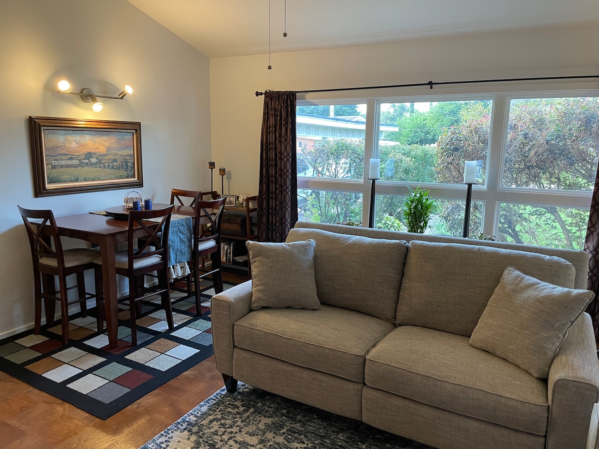 Amplia casa de dos niveles con un espacio habitable de concepto abierto perfecto para pequeñas reuniones y familias. Junto al comedor hay una terraza extragrande con parrilla, un gran patio trasero vallado y un pozo de fuego para tu disfrute. El estudio del sótano ofrece una gran TV de 60 pulgadas con Amazon Video. Hay tiendas de comestibles, restaurantes y mucho más cerca. También hay lavandería disponible. *Por favor, pregunta si estás interesado en una estancia más larga, es posible que tengamos disponibilidad que no aparece en el calendario.