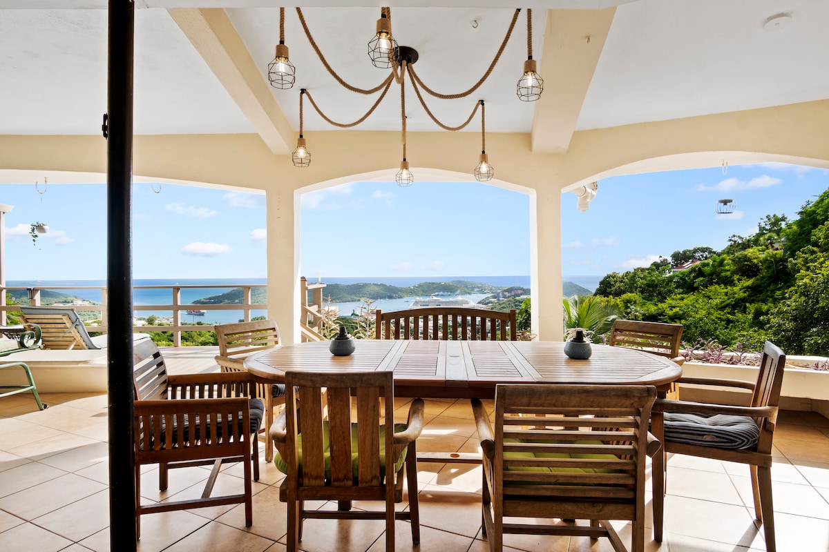 ¡Duerme con el sonido de las olas del mar en tu paraíso privado con vistas panorámicas! Esta casa independiente cuenta con 3 camas tamaño king nuevas, dormitorios con aire acondicionado, una cocina de chef con cocina a gas y wifi de alta velocidad para trabajar a distancia, y un generador de casa completa. ¡Los espacios llenos de energía se abren a impresionantes vistas que se extienden hasta St. John! SUV opcional de 7 asientos para aventuras inolvidables en la isla. Ideal para niños, perfecto para familias. Estacionamiento fácil y ubicación tranquila y aislada. ¡Una casa súper céntrica, con un valor increíble!