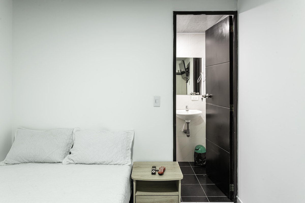 Este acogedor apartaestudio es de uso exclusivo, independiente y privado consta de una habitación amplia, con una cama doble, TV, clóset y mesa de escritorio, baño con agua caliente y una cocineta con nevera la cual tiene lo necesario para cocinar como ollas, loza, cubiertos y otros adicionales. El apartaestudio se encuentra ubicado en la parte de atras de la casa principal, por lo que la entrada es compartida entre ambos. El apartaestudio tiene una buena iluminación, es muy limpio y acogedor