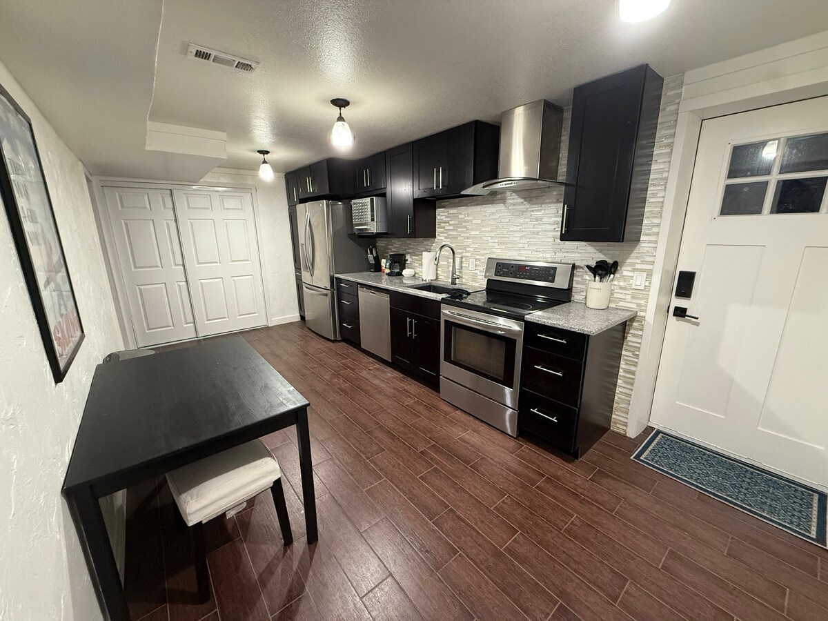 Apartamento en el sótano actualizado situado muy cerca del pequeño cañón de algodoncillo (no accesible para discapacitados). A 15 minutos a pie de la estación de autobuses de esquí que va a Little y Big Cottonwood Canyon. A poca distancia a pie de muchos negocios como farmacia, tienda de comestibles, licorería, comida rápida y restaurantes. Concepto de planta abierta con su propia entrada independiente. Cuenta con una gran sala de estar, un dormitorio grande y un baño grande. Es de unos 1000 pies cuadrados.