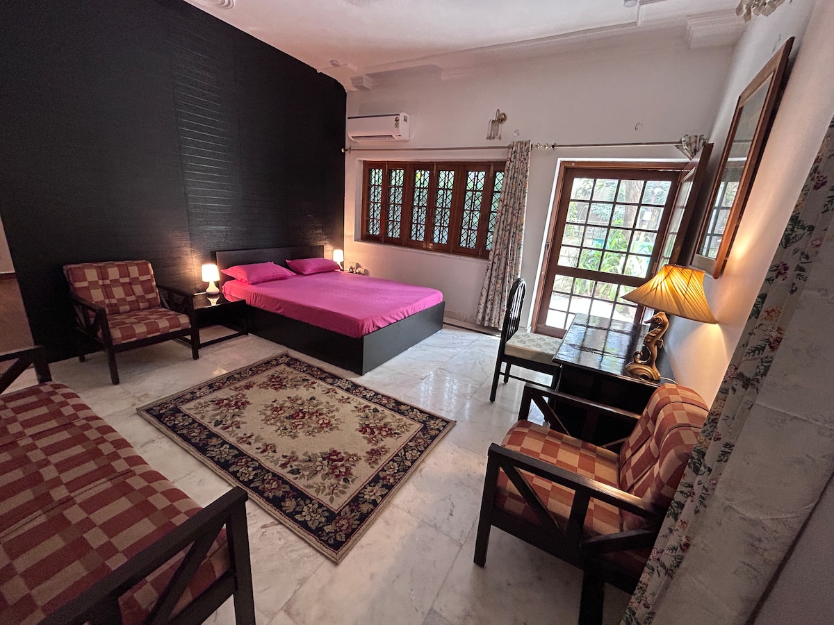 Do you want to bond with family, friends or colleagues in the lap of nature in New Delhi? Do you wish to experience the ideal blend of old-world charm and hospitality with all modern amenities? Do you desire to take a stroll in sprawling lawns under fruit trees or lie in wait for peacocks? If YES then this independent 3-bedroom apartment of Shiv Niwas villa, with private balconies & roof terrace, smart locks, property-wide high-speed Wi-Fi, free car parking & caring lady caretaker-cooks BECKONS!