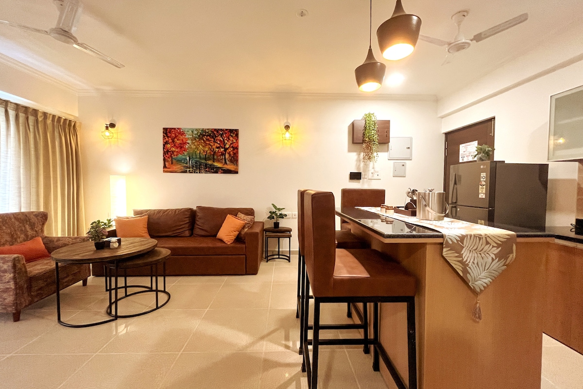 Modern Boho Apartment | Minutes from North Goa's Beaches.A cosy, fully furnished 1BHK retreat perfect for couples, friends, or small families. Highlights: - Stylish boho interiors with a warm vibe - AC in bedroom & living room for comfort - Smart TV + High-speed WiFi - Equipped kitchen with RO water, cooktop, fridge & washing machine - Shared swimming pool (9 AM–6 PM | swimwear mandatory - On-site gym available as a paid facility - 24/7 security for peace of mind - Free Parking