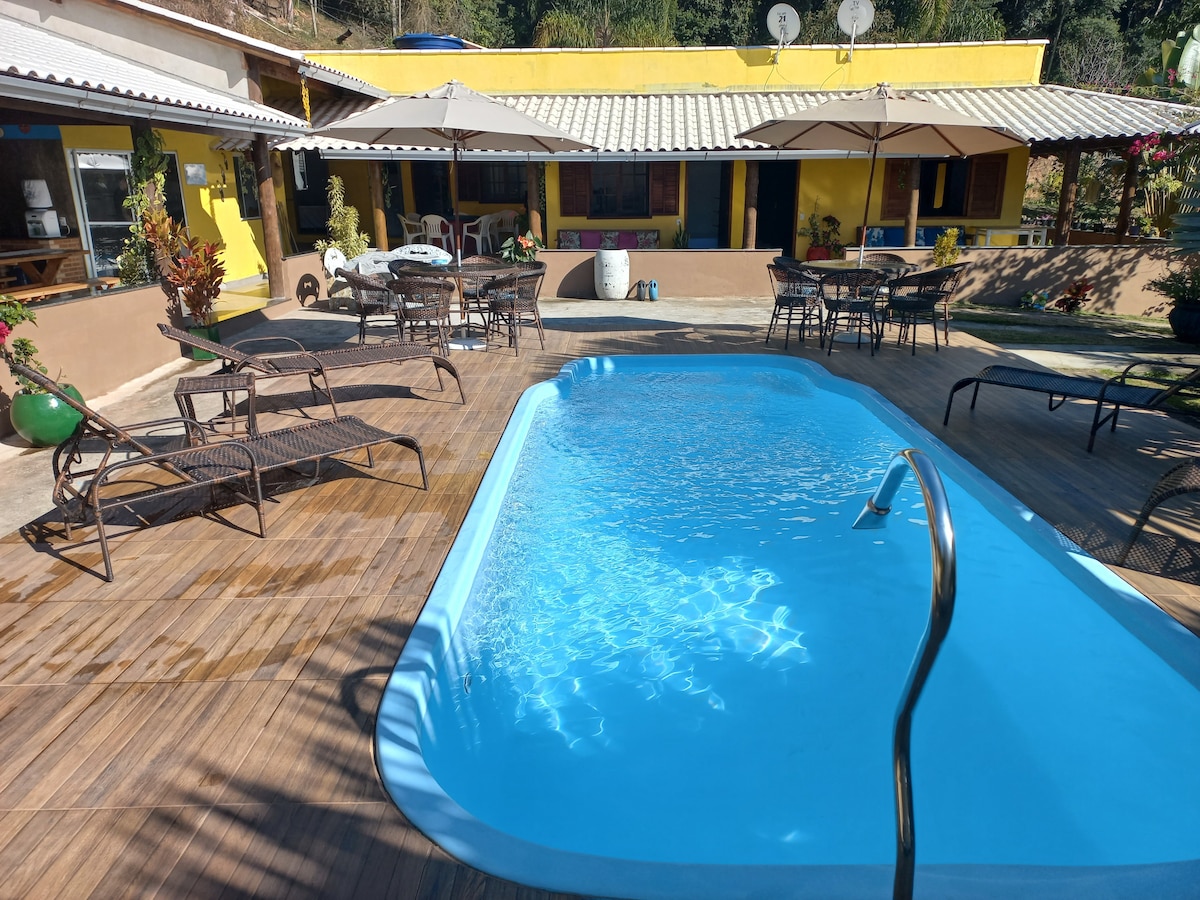Casa de campo con 200 mt2 de área construida, todo rodeado por un hermoso balcón colonial, gran sala de estar con cocina americana, 4 dormitorios, siendo 2 suites y las otras 2 suites demi, una de las habitaciones tiene aire acondicionado, la casa tiene internet de fibra óptica Wi-Fi, casa súper espaciosa, gran área de césped con varios árboles frutales, piscina, barbacoa, gran área de césped. Lugar muy tranquilo, poco movimiento. Ideal para desconectar, disfrutar de la naturaleza y cantar pájaros